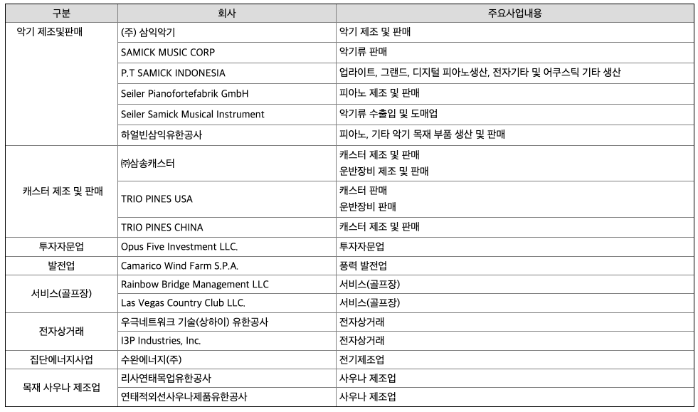 2) 당사는 선진국들의 보호무역 장벽강화, 원목 수출국들의 자원보호주의 및 국내 인건비 상승에 따른 수출경쟁력 약화를 해결코자 원자재 수급 및 인건비 면에서 유리하다고 판단되는 인도네시아 자바 지역에 현지공장 ( P.T SAMICK INDONESIA)을 1990년에 설립하여 나왕, 미송, 합판등의 원재료를 안정적으로 공급받고 있으며, 1993년 8월부터는 일반 Guitar, 1995년 5월부터는 전기 Guitar, 1996년 8월부터는 업라이트 피아노, 1998년 2월부터는 그랜드 피아노, 2003년 6월부터는 디지털피아노를 각각 생산하는 종합악기회사로 도약하였으며, 중국 하얼빈시에도 현지공장(하얼빈 삼익악기 유한공사)을 1989년 6월 설립하여 악기부품을 공급하고 있습니다. 이에 더하여 2003년 11월에는 중국 상해에 벡스타인 상해공장을 설립하여 피아노 완제품 및 부속품등이 생산되고 있으며, 2005년 12월에는 중국상해에 판매법인을 설립하여중국 시장의 공략을 위한 전초기지로서 역할을 하고 있습니다. 2008년 11월에는 160년 전통의 독일피아노 회사인 자일러(Seiler Pianofortefabrik GMBH)사를 인수하여 기술협력을 바탕으로 국내와 유럽 및 중동시장까지 적극 공략할 수 있는 생산 및 영업에 시너지 효과를 기대하고 있습니다. 특히 최근에는 중국의 중산층 확대와 소득수준 향상에 따라 상대적으로 가격이 비싼 중고가 가격대의 피아노시장이 크게 확대되는바 당사의 자일러 피아노등 고가 브랜드의 매출 점유율이 증대하고 있습니다. 중국악기 시장은 향후에도 1가구 1자녀 정책 폐지와 소득 및 교육수준 향상으로 크게 증가될 것으로 보여 중국 판매법인과 협력하여 매출 증대 및 이익향상에 노력을 경주하고 있습니다. 이 밖에도 악기외 업종인 삼송캐스터는 수동운반기구 및 피아노 바퀴인 캐스터를 생산/판매하는 사업법인으로 해외수입품에 의존하던 의료기기용 바퀴를 국산화하여 국내 유수의 종합병원에서 호평받는 등 국내 의료장비의 발전에 기여하고 있으며, 또한 자동차 생산라인에서 주로 사용하는 완충용 무소음 캐스터를 개발하여 국내 대기업은 물론 일본의 자동차 회사에 공급하는 등 세계적으로 품질을 인정받고 있습니다.
