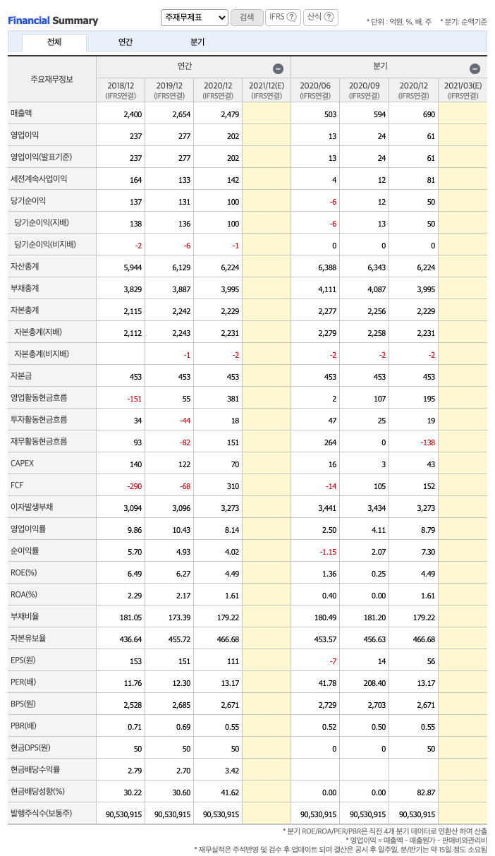 FCF(미래현금흐름) : 2018년 -290억원, 2019년 -68억원, 2020년 310억원으로 2020년의 미래현금흐름은 좋습니다.