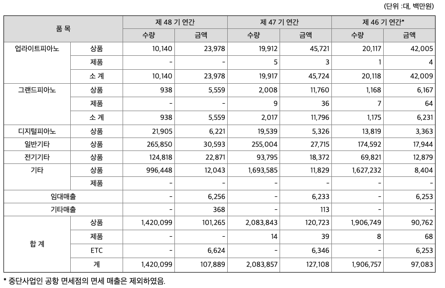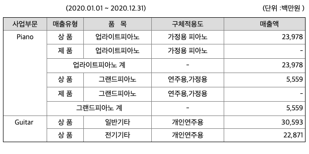 회사의 주업종인 악기사업의 주요 제품 품목군은 Piano사업부문, Guitar사업부문, 일반악기 사업부가 있습니다. 피아노사업부는 일반가정용인 업라이트피아노, 전문연주용인 그랜드피아노, 디지털피아노를 생산/판매하고 있으며, Guitar 사업부는 어쿠스틱기타, 클래식기타, 전기기타를 생산/판매하고, 일반악기 사업부는 바이올린, 첼로 등 현악기, 플롯, 섹소폰 등 관악기, 교재용악기 등을 판매하고 있습니다.