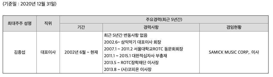 당사는 본사(충북 음성군 소재)를 거점으로 한국 및 해외현지에 17개의 생산, 판매 법인등을 설립하여 악기업종을 위주로 사업을 영위하는 종합악기 회사입니다.