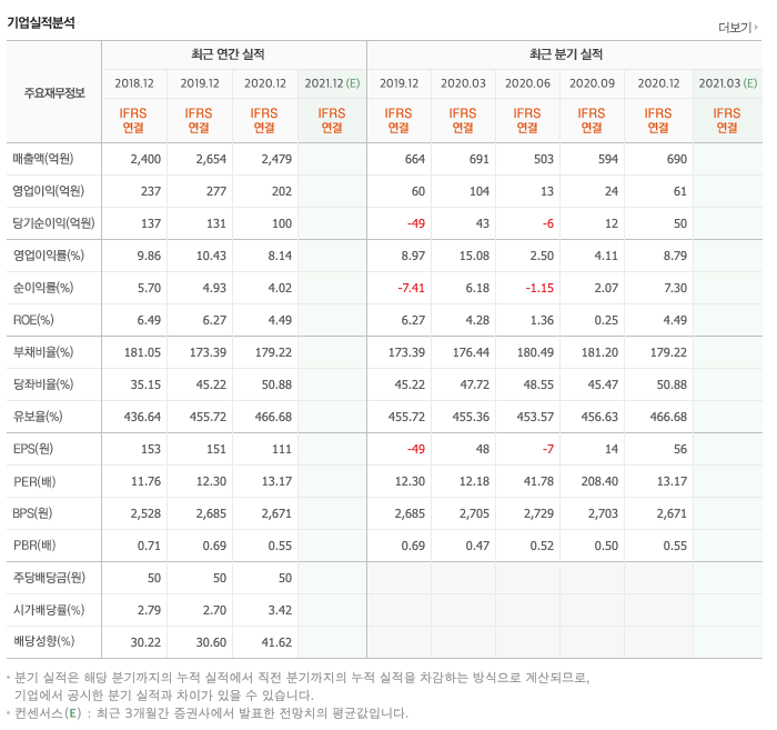 매출액 : 2017년 2220억원, 2018년 2400억원, 2019년 2654억원으로 증가하였고, 2020년 2479억원으로 감소하였습니다. 2020년은 전년동기대비 -6.6% 감소하였습니다. 2020년 분기별로 보면 1분기 691억원, 2분기 503억원, 3분기 594억원, 4분기 690억원입니다.