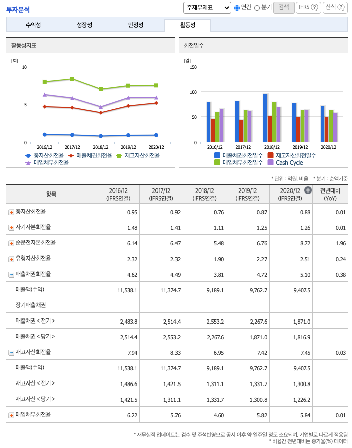 매출채권회전율 : 2018년 약 2267억원, 2019년 약 1871억원, 2020년 약 1816억원이고, 회전율은 2018년 약 3회, 2019년 약 4회, 2020년 약 5회로 안정적입니다.