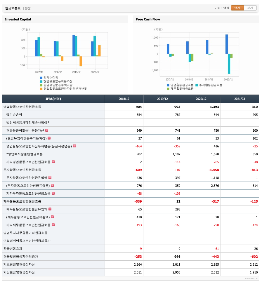 영업활동 현금흐름 : 2018년 904억원, 2019년 993억원, 2020년 1393억원, 2021년 1분기 310억원으로 영업활동 현금흐름이 원활합니다.
