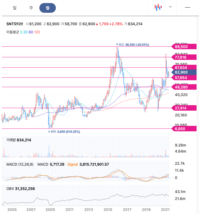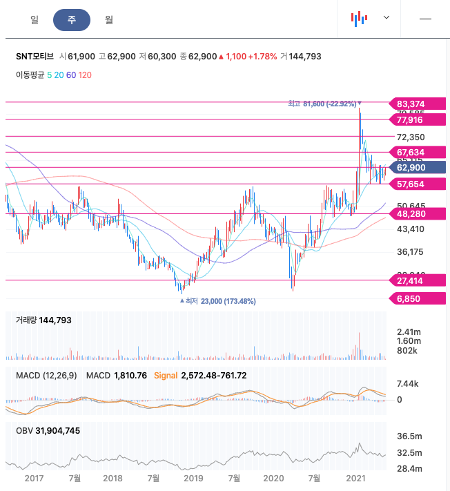 SNT모티브는 21년 1월 급등하여 최고점 81,600원을 찍고 조정을 받고 있습니다.