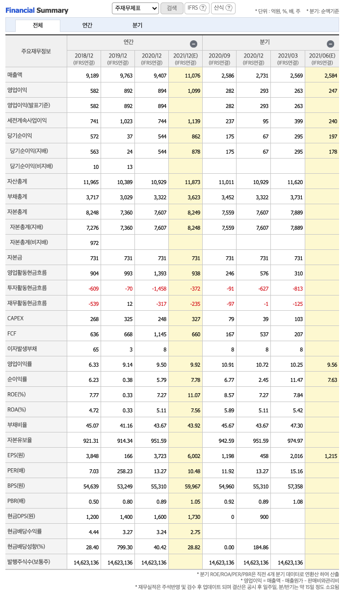 FCF(미래현금흐름) : 2018년 636억원, 2019년 668억원, 2020년 1145억원으로 미래현금흐름이 좋습니다. 2021년은 억원으로 660추정됩니다.