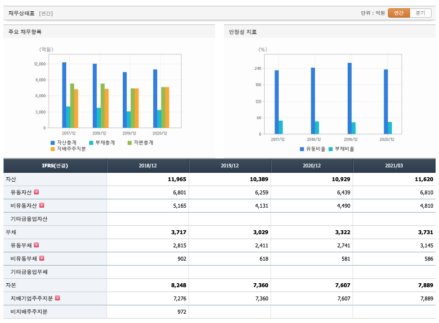 투자활동 현금흐름 : 2018년 -609억원, 2019년 -70억원, 2020년 -1458억원, 2021년 1분기 -813억원으로 영업활동 현금흐름이 원활합니다.