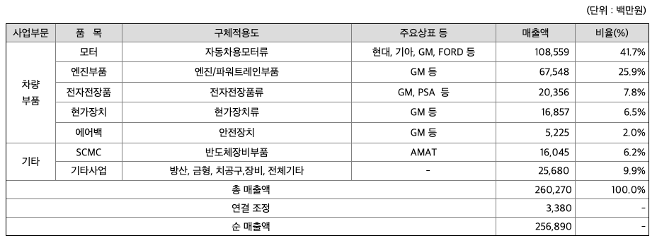 당사의 사업부문은 수익을 창출하는 재화와 용역의 성격, 이익 창출단위, 제품 및 제조공정의 특징, 시장 및 판매방법의 특징, 사업부문 구분의 계속성 등을 고려하여 경영의 다각화 실태를 적절히 반영할 수 있도록 차량부품, 기타 사업부로 세분화 하였습니다. 당사 및 종속회사 사업부문 현황을 요약하면 아래와 같습니다.