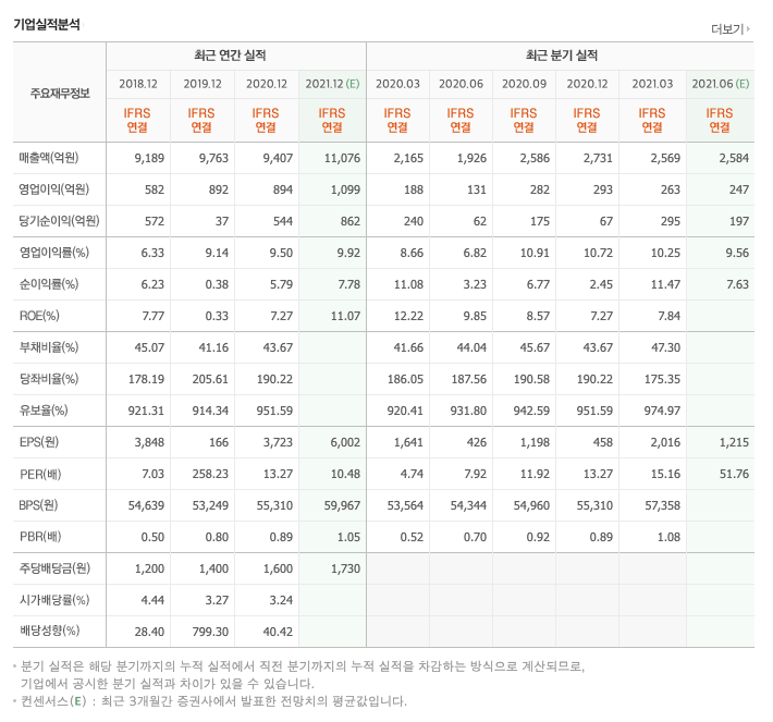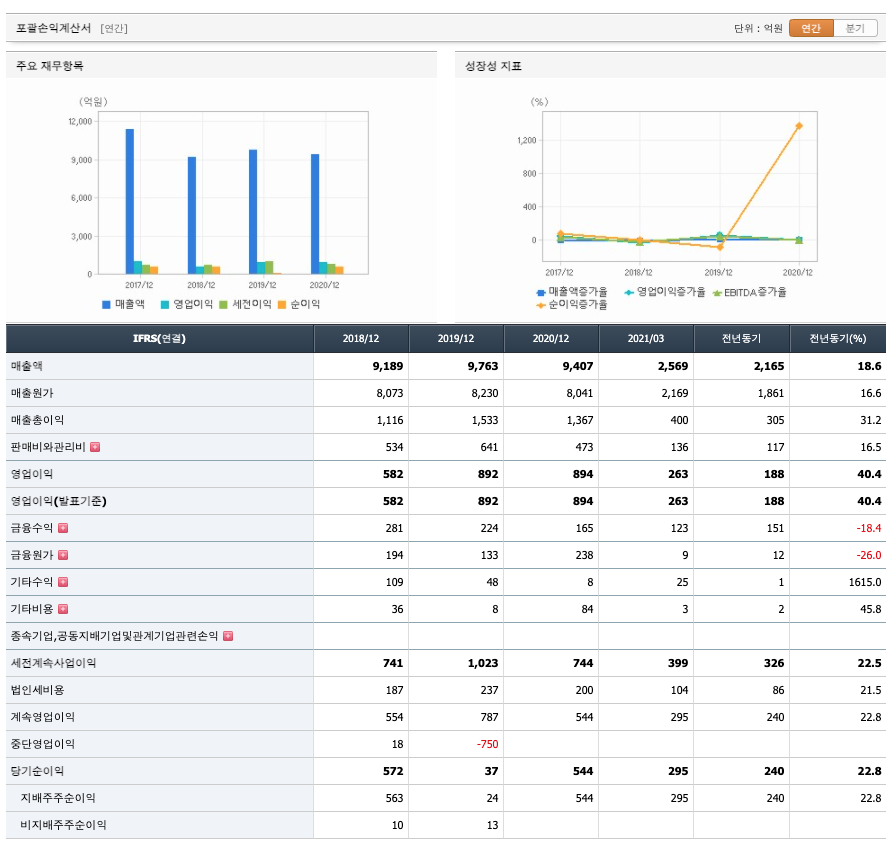 매출액 : 2018년 9189억원, 2019년 9763억원으로 증가하였고, 2020년 9407억원, 2021년 1분기는 2569억원으로 증가하였습니다. 2021년 1분기는 전년동기대비 18.6% 증가하였습니다. 2020년 분기별로 보면 2분기 1926억원, 3분기 2586억원, 4분기 2731억원입니다.