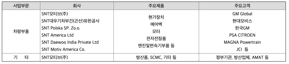 당사의 자동차부품사업은 글로벌 시장에서 오랜 기간 쌓아온 기술력을 바탕으로 친환경 자동차용 모터, 드라이브 유닛을 비롯해 엔진 및 변속기 부품, 현가장치, 계기판등을 개발, 생산하고 있습니다. 그동안 자동차용 첨단 핵심부품 개발활동에 심혈을 기울임으로써 제품의 고부가가치화, 고기능화, 지능화, 전문화의 기반을 공고히 다져왔으며 그 결과 Global Project 수주를 통해 글로벌 Tier-1 공급업체로 자리잡았습니다. 특히 2006년 SNT모티브 출범 이후 글로벌GM(Genenral Motors)을 비롯해 현대·기아차, 푸조, 다임러, 포드 등 다양한 글로벌 완성차업체들에게 기술력 및 품질을 인정받으며 부품을 공급해 명실공히 세계적인 자동차부품 회사로 성장하고 있습니다.