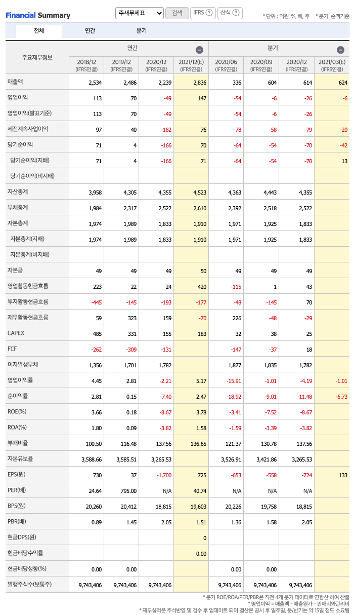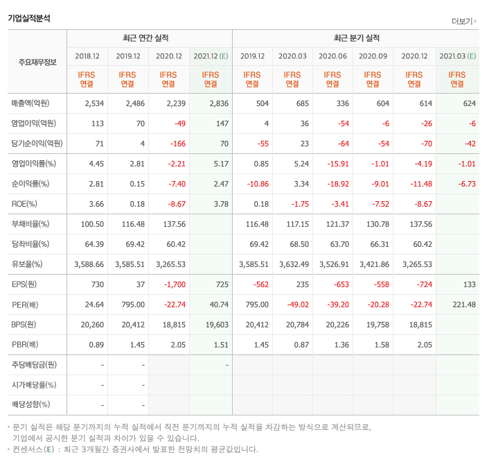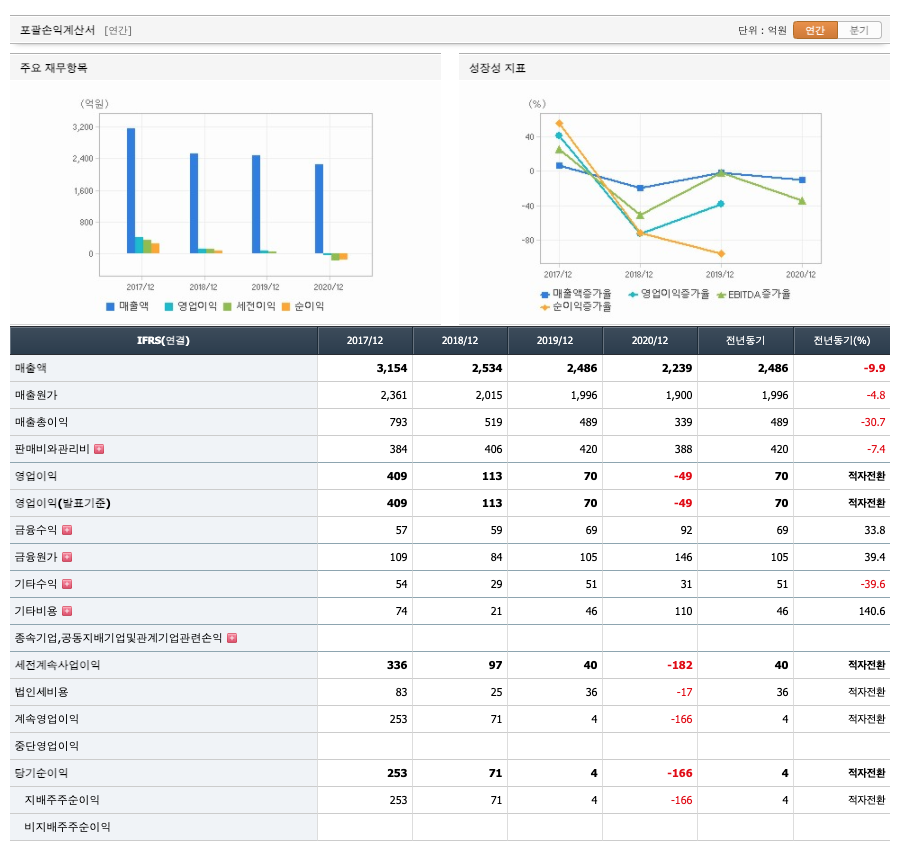 영업이익 : 2017년 409억원, 2018년 113억원, 2019년 70억원, 2020년 -49억원으로 적자전환하였습니다. 2020년 분기별로 보면 1분기 -36억원, 2분기 -54억원, 3분기 -6억원, 4분기 -26억원입니다.