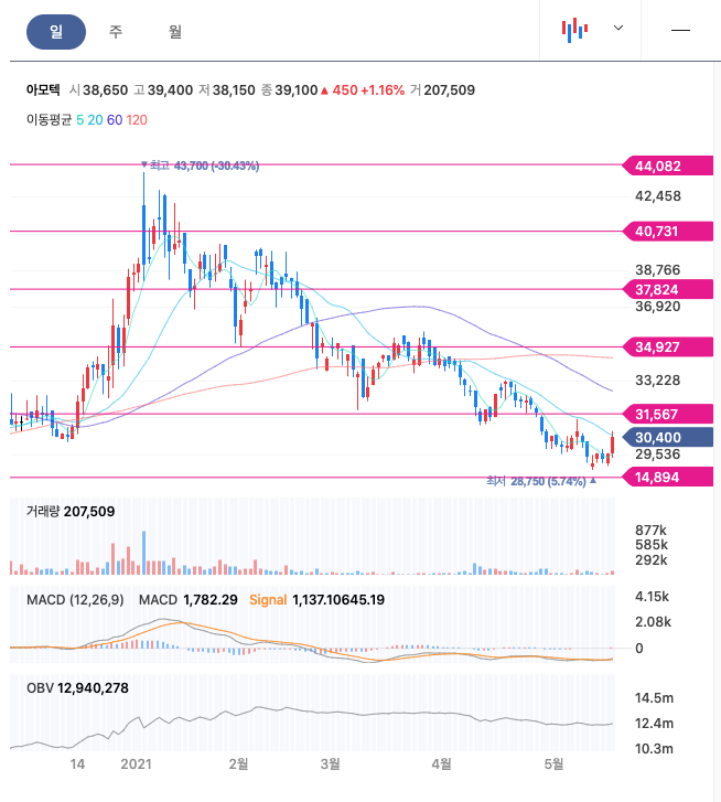 아모텍은 20년 12월 크게 급등하여 21년 최고점 43,700원을 찍고 조정을 깊게 받았습니다.