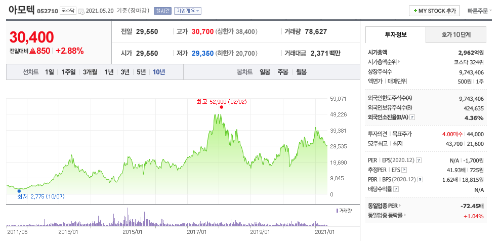 아모텍의 2021년 영업이익은 147억원으로 추정됩니다. 현재(21. 5. 20) 시가총액은 2962억원으로 멀티플 20입니다.