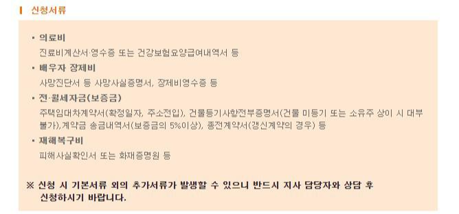 의료비는 진료비 계산서나 영수증, 장제비는 사망진단서, 등의 사망 사실 증명서, 전월세 자금은 주택 전월세 계약서, 재해 복구비는 피해 사실 확인서가 필요합니다. 해당하는 긴급 자금에 대한 서류를 준비해야 합니다.