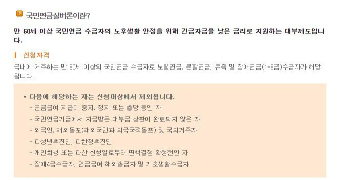 국민연금 관리공단은 2012년부터 "실버론"이라는 노후 생활안정자금 대출을 진행하고 있습니다.