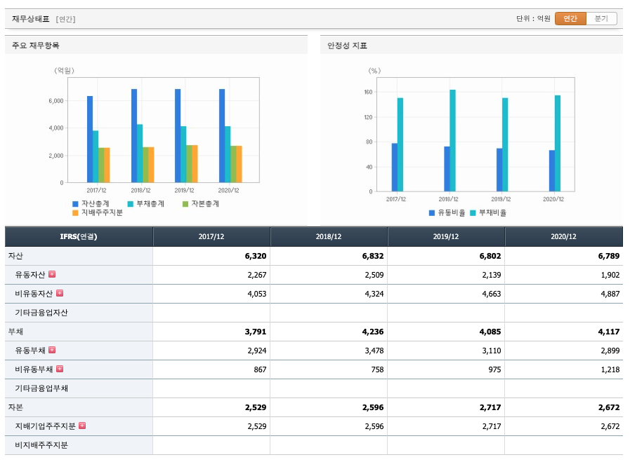 부채비율 : 2018년 약 163%, 2019년 약 150%, 2020년 약 154%로 증감을 오가고 있으며, 표준(100%)보다 높아 부채비율이 안정적이지 못합니다.