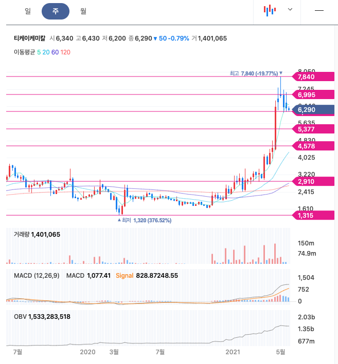 티케이케미칼은 21년 3월에 급등한 이후 최고점 7840원을 찍고 조정을 받고 있습니다.
