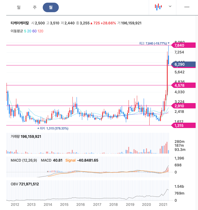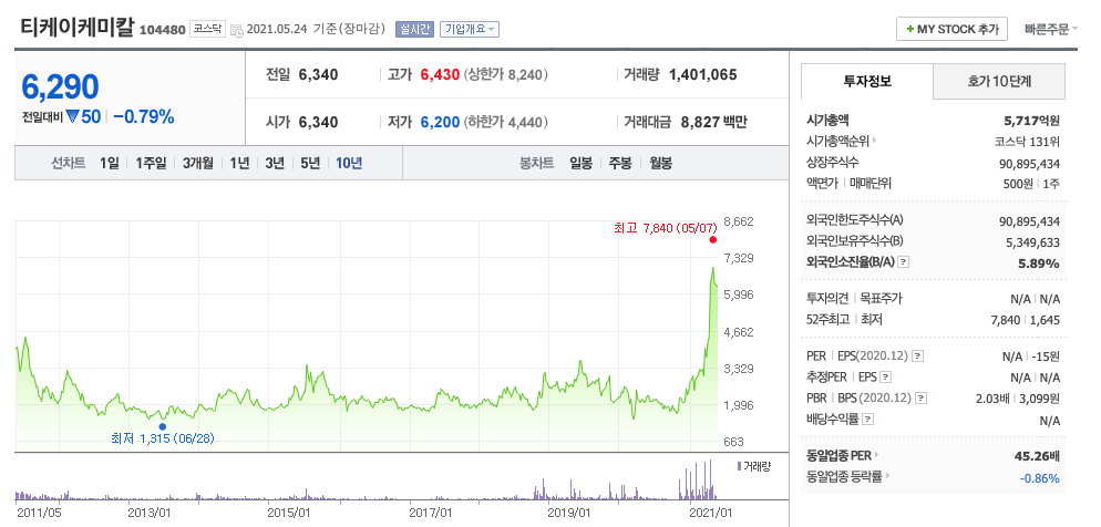 | 티케이케미칼 | 6290원 | 4907원 | 4741원 | 4864원 |