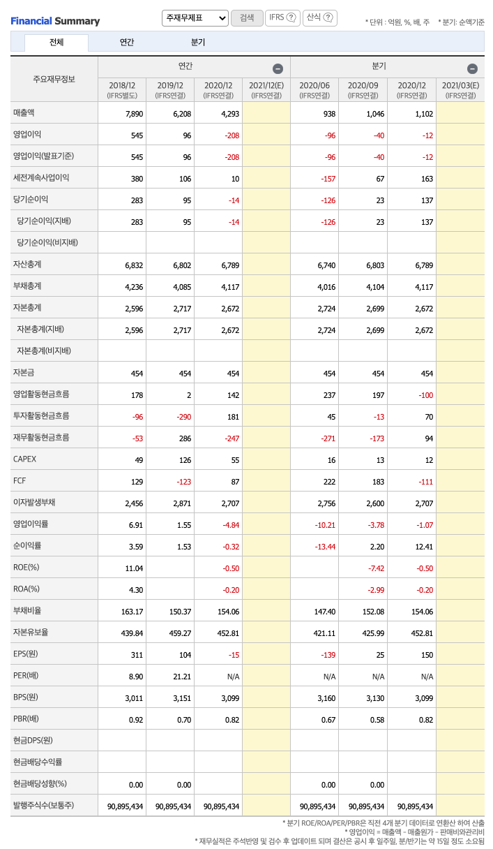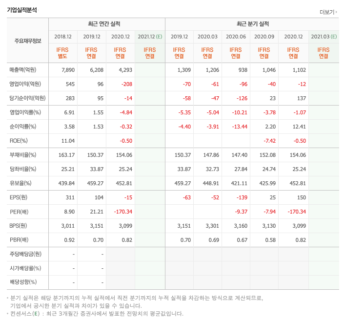 영업이익 : 2017년 95억원, 2018년 545억원, 2019년 96억원, 2020년 -208억원으로 적자전환하였습니다. 2020년 분기별로 보면 1분기 -61억원, 2분기 -96억원, 3분기 -40억원, 4분기 -12억원입니다.