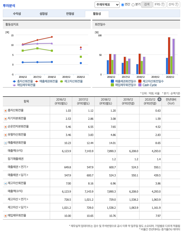 재고자산회전율 : 2018년 약 1538억원, 2019년 약 1063억원, 2020년 약 1161억원이고, 회전율은 2018년 약 6회, 2020년 약 3회로 안정적입니다.