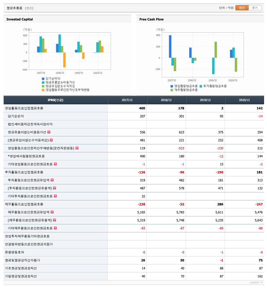 FCF(미래현금흐름) : 2018년 129억원, 2019년 -123억원, 2020년 87억원으로 2018년과 2020년의 미래현금흐름이 좋습니다.