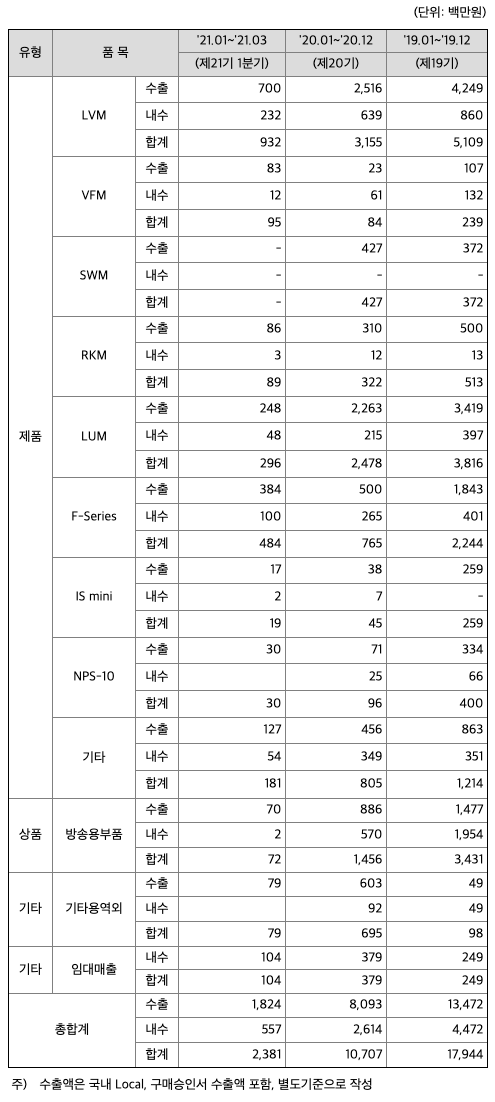 방송장비 산업은 그 범위와 종류가 매우 다양하게 존재하므로 시장규모와 시장점유율을 명확하게 산출하기는 쉽지 않지만, 영국 시장조사 기관 Futuresource 자료에 따르면 판매 대수 기준으로, 당사는 일본 대기업인 SONY, 영국 대기업 Vitec Group에 인수된 SmallHD(미국)에 이어 3위를 점하고 있습니다. 하지만 SmallHD의 경우 $500 이하의 저렴한 뷰파인더 모니터를 주력제품으로 하고 있어, 판매 금액을 기준으로 보면, 다양한 인치를 판매하는 당사가 Sony에 이어 2위를 차지하고 있습니다.