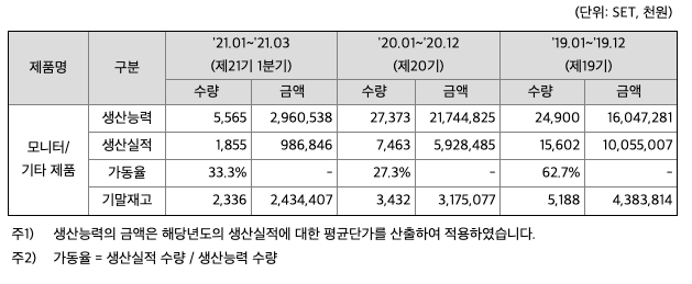 이외에도 공공기관, 교회, 학교, 방송국 및 일반 기업체에도 일부 수요가 존재하며 이들 기관들의 사내(교내) 방송국 등에도 당사의 방송용 디스플레이가 설치되고 있습니다. 이들은 방송용 디스플레이의 주요 수요처라고는 할 수 없지만 무시할 수 없는 수준의 꾸준한 수요를 갖고 있습니다. 특히 당사는 학생들이 당사의 미래 잠재고객이라고 인식하고, 학생들이 당사 제품에 친근감을 갖고 향후 다시 찾을 수 있도록 교육기관에 적극적인 지원을 하고 있습니다.