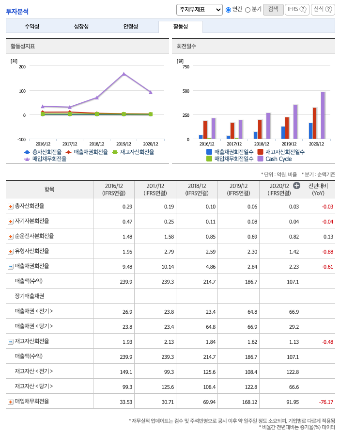 매출채권회전율 : 2018년 약 64억원, 2019년 약 66억원, 2020년 약 29억원이고, 회전율은 2018년 약 4회, 2019년 약 2회, 2020년 약 2회로 안정적입니다.
