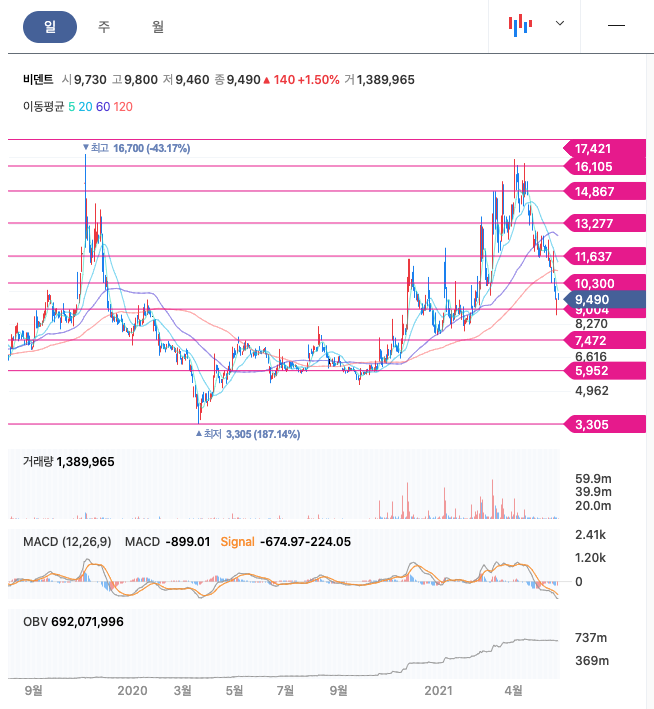 비덴트는 20년 11월에 급등 후 급등락을 오가고 있으며, 21년 4월에 최고 16450원을 찍고 크게 조정을 받고 있습니다.