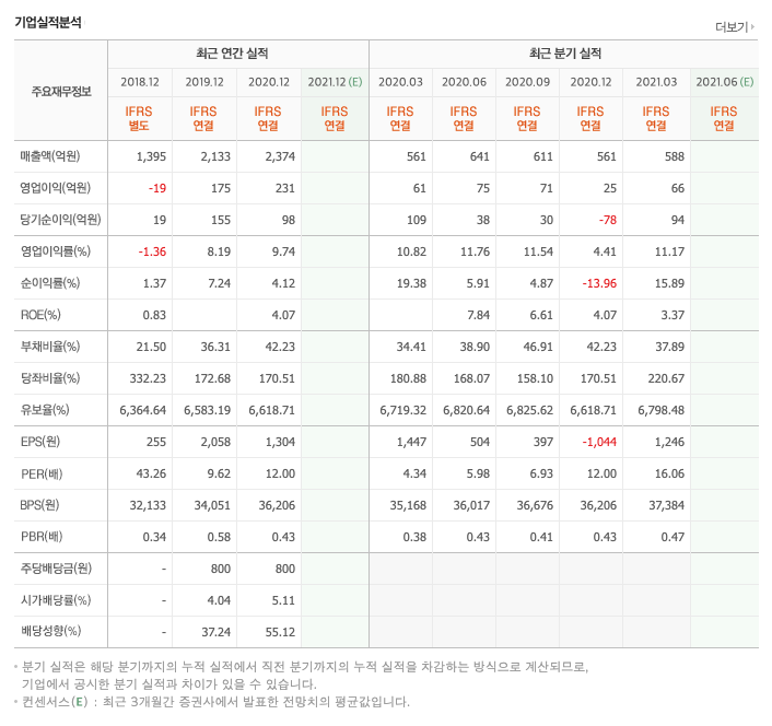 영업이익 : 2018년 -19억원, 2019년 175억원, 2020년 231억원, 2020년 1분기 66억원으로 증가하였습니다. 2021년 1분기는 전년동기대비 8.3% 증가하였습니다. 2020년 분기별로 보면 2분기 75억원, 3분기 71억원, 4분기 25억원입니다.