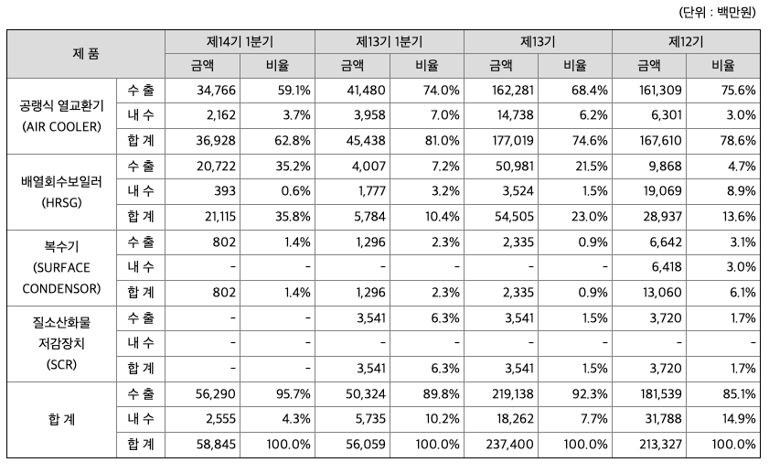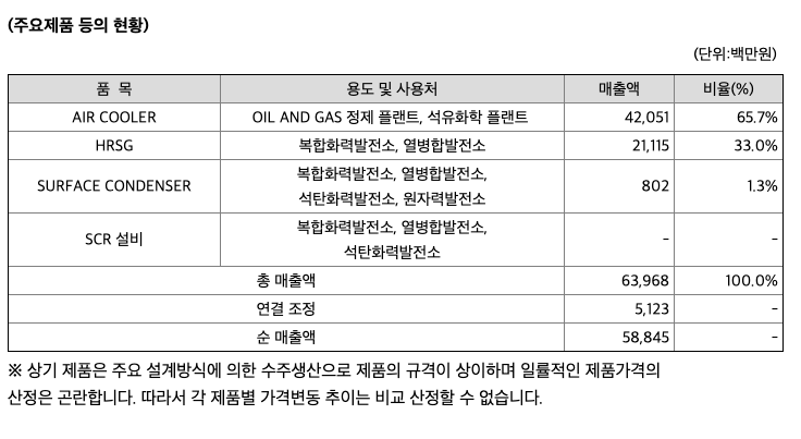 당사 및 연결종속회사에서 생산하는 주요 제품으로는 공랭식열교환기와 배열회수보일러, 복수기 및 SCR설비 등이 있습니다.
