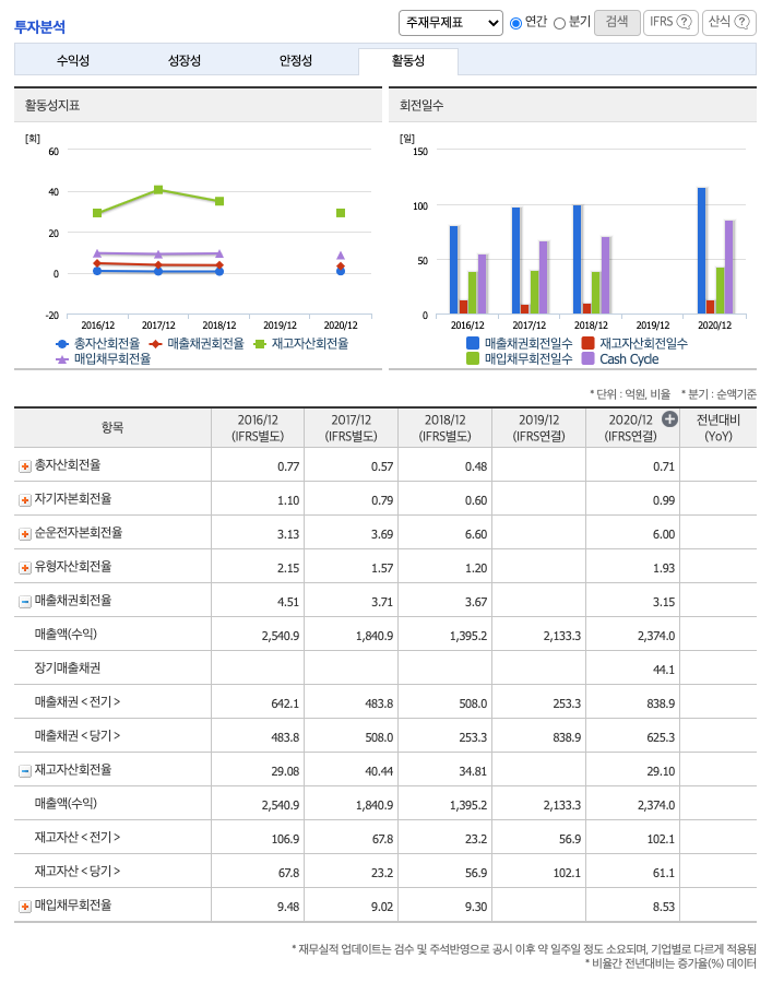 매출채권회전율 : 2018년 약 253억원, 2019년 약 838억원, 2020년 약 625억원이고, 회전율은 2018년 약 3회, 2020년 약 3회로 안정적입니다.