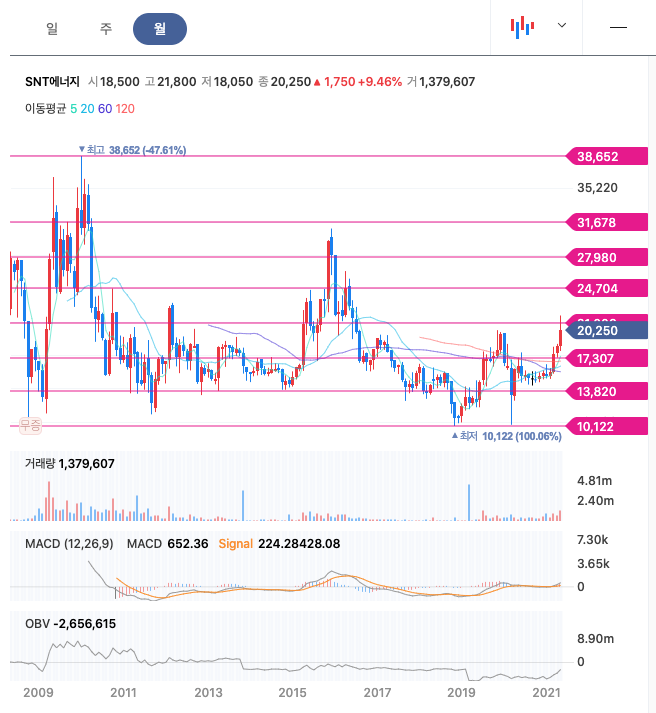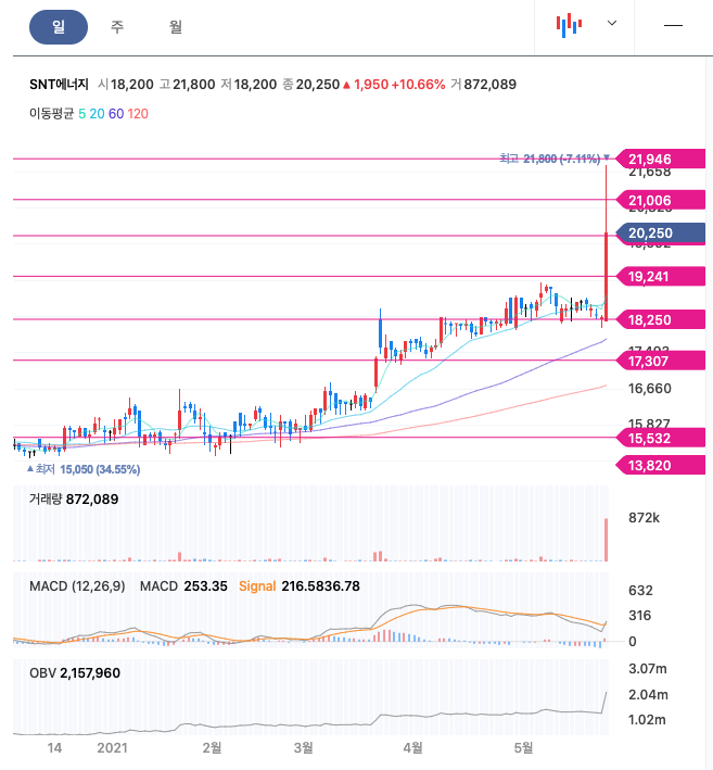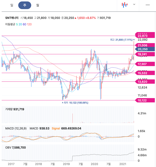 SNT에너지는 21년 3월에 급등하여 주가가 레벨업하였고, 꾸준한 우상향과 함께 21년 5월 급등하여 최고점 21,800원을 찍었습니다.
