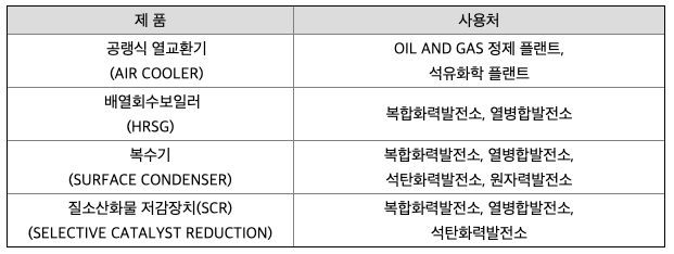 당사는 OIL 및 GAS 정제 플랜트와 석유화학플랜트로 대표되는 화공플랜트에 사용되는 제품인 공랭식 열교환기와 복합화력발전소와 열병합 발전소, 그리고 원자력 발전소에 사용되는 제품인 배열회수보일러, 복수기 및 대표적인 대기오염 성분인 질소 산화물을 저감시키는 설비인 SCR(SELECTIVE CATALYST REDUTION) 등을 설계 및 생산하고 있습니다.