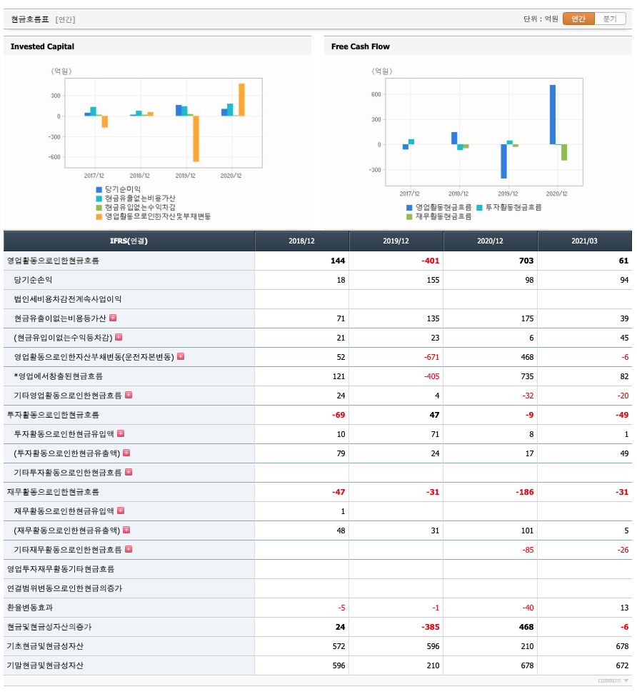 영업활동 현금흐름 : 2018년 144억원, 2019년 -401억원, 2020년 703억원, 2021년 1분기 61억원으로 2019년을 제외하고 영업활동 현금흐름이 원활합니다.