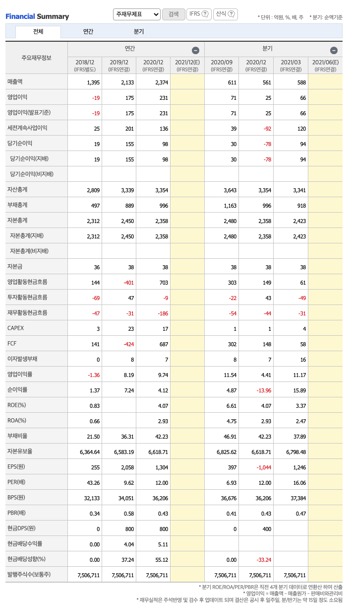 투자활동 현금흐름 : 2018년 -69억원, 2019년 47억원, 2020년 -9억원, 2021년 1분기 -49억원으로 2019년을 제외하고 투자활동 현금흐름이 원활합니다.