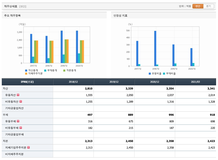 재무활동 현금흐름 : 2018년 -47억원, 2019년 -31억원, 2020년 -186억원, 2021년 1분기 -31억원으로 재무활동 현금흐름이 마이너스로 원활합니다.