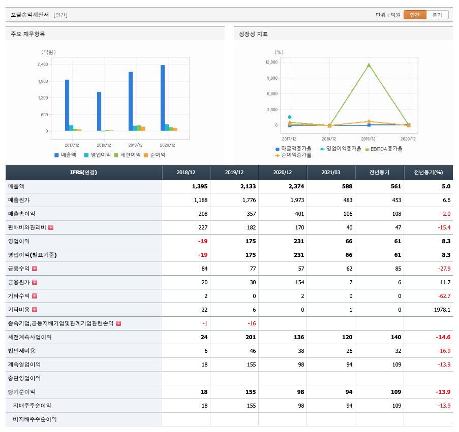 매출액 : 2018년 1395억원, 2019년 2133억원, 2020년 2374억원, 2021년 1분기 588억원으로 증가하였습니다. 2021년 1분기는 전년동기대비 5% 증가하였습니다. 2020년 분기별로 보면 2분기 641억원, 3분기 611억원, 4분기 561억원입니다.