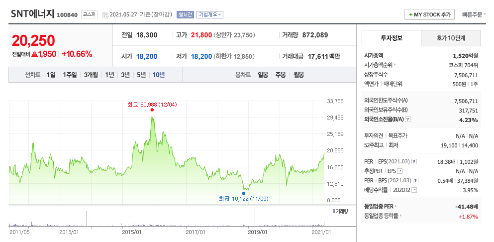 | SNT에너지 | 20250원 | 17698원 | 17543원 | 17851원 |