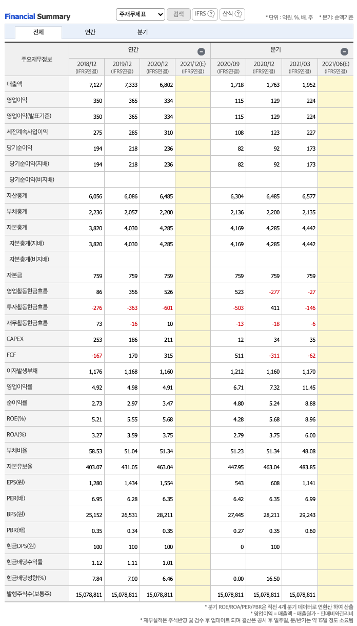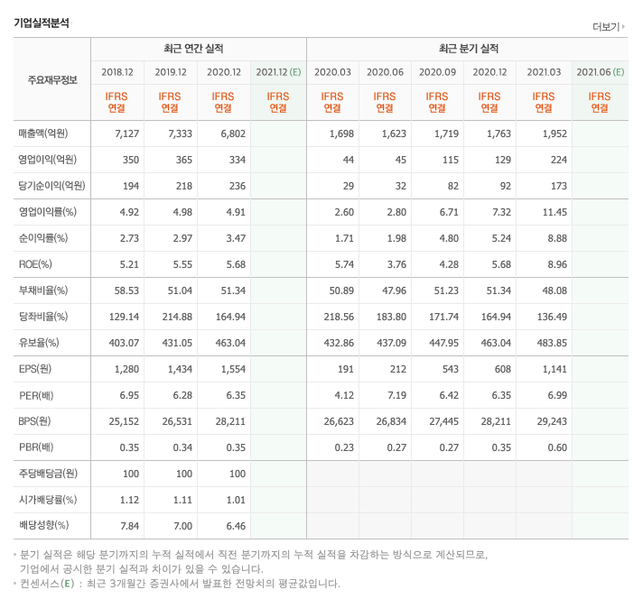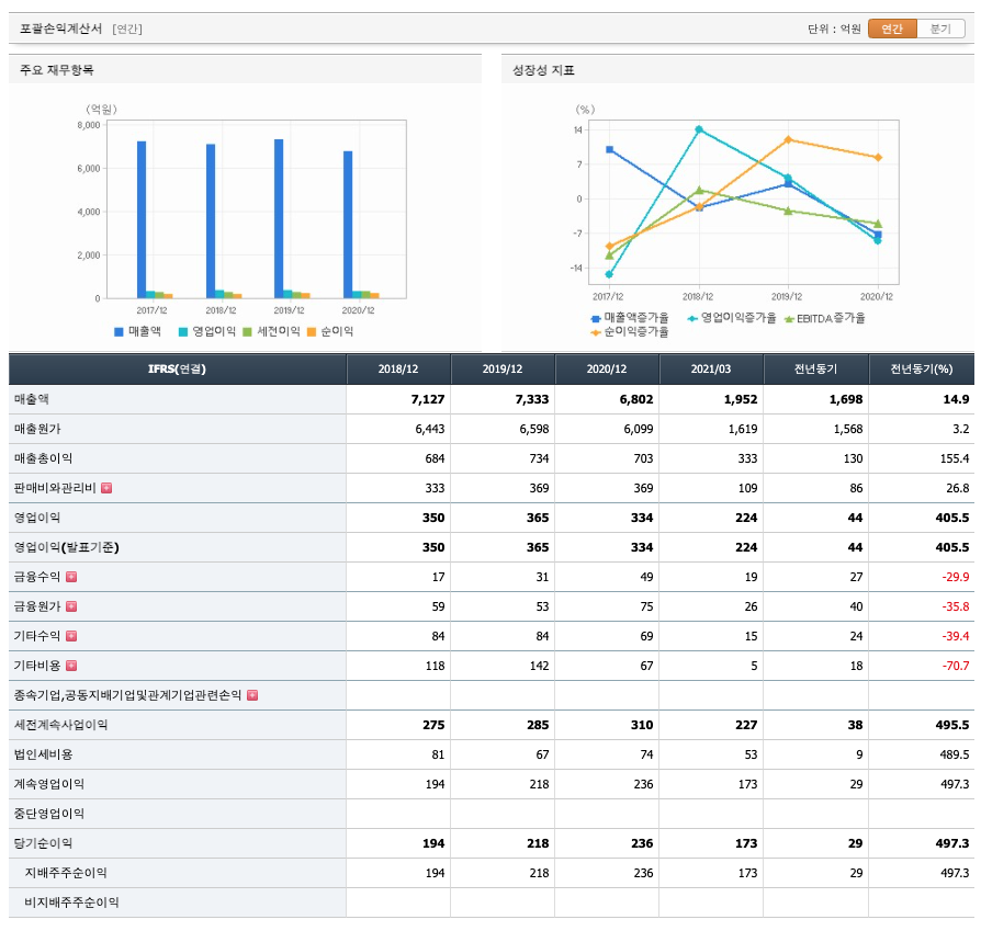 매출액 : 2018년 7127억원, 2019년 7333억원으로 증가하였고, 2020년 6802억원으로 감소하였고, 2021년 1분기 1952억원으로 증가하였습니다. 2021년 1분기는 전년동기대비 14.9% 증가하였습니다. 2020년 분기별로 보면 2분기 1623억원, 3분기 1719억원, 4분기 1763억원입니다.