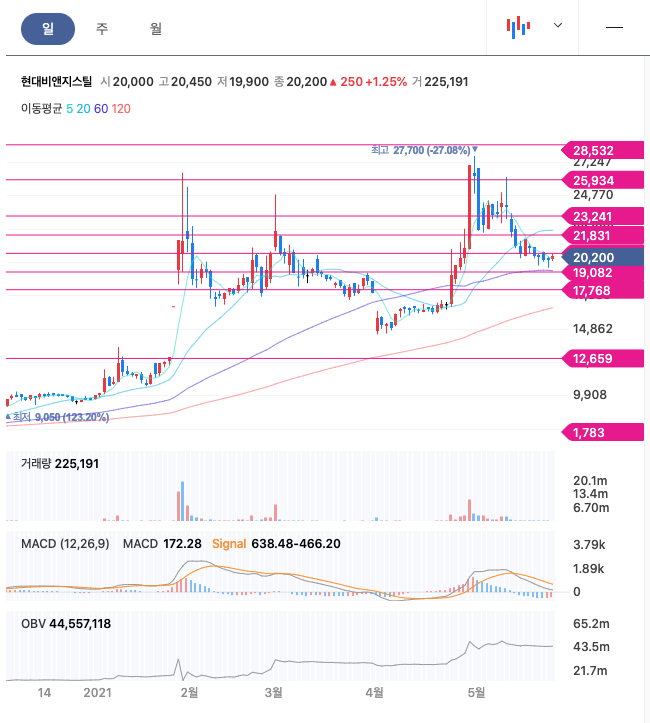 현대비앤지스틸은 21년 1월에 급등하여 조정을 받다가 4월에 다시 반등하여 재급등하였고, 최고점 27,700원을 찍고 조정을 받고 있습니다.