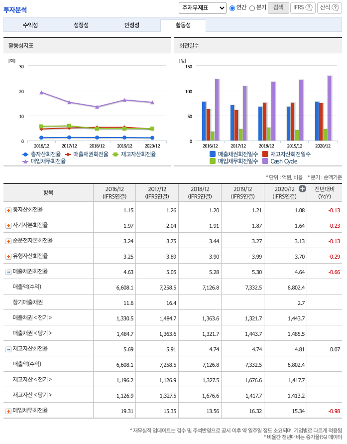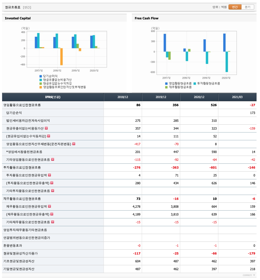 투자활동 현금흐름 : 2018년 억원, 2019년 억원, 2020년 억원, 2021년 1분기 억원으로 투자활동 현금흐름이 원활합니다.