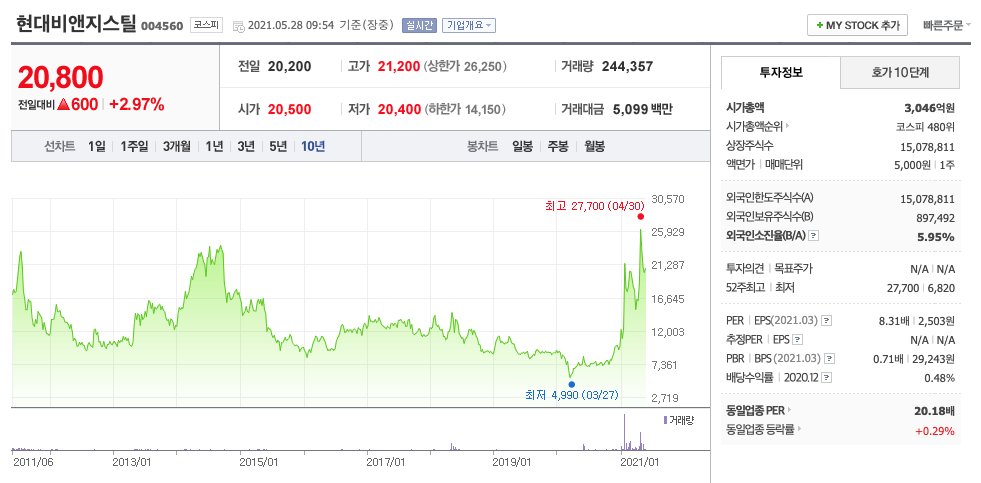 | 현대비앤지스틸 | 20800원 | 21757원 | 20225원 | 22172원 |