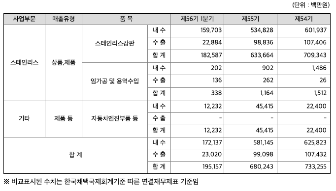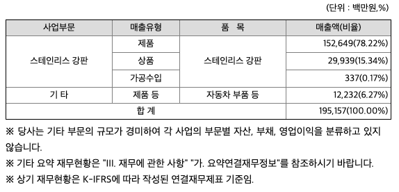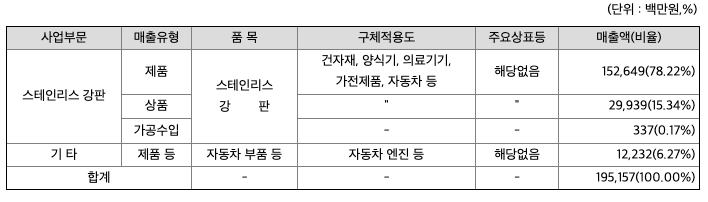 당사는 스테인리스 냉연강판을 생산하는 제조업체로 스테인리스 강판의 매출액 비중이 전체 매출액의 약 94%를 차지하고 있습니다.