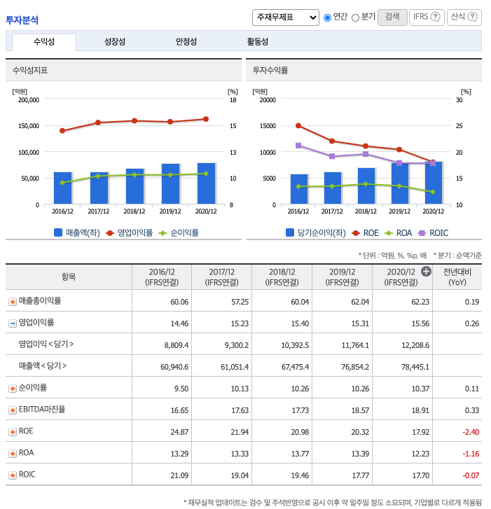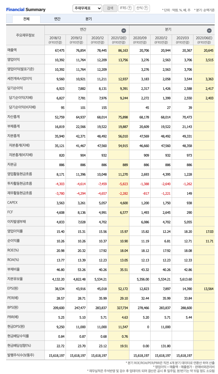 FCF(미래현금흐름) : 2018년 4608억원, 2019년 8136억원, 2020년 4991억원으로 미래현금흐름이 좋습니다. 2021년은 6577억원으로 추정됩니다.