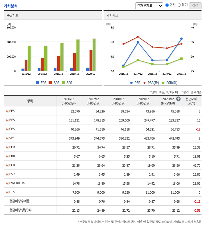 DPS(Dividend Per Share의 약자, 총배당금을 총주식발생수로 나눈 것, 한 주당 얼만큼의 배당금을 받을 수 있는지 알 수 있는 지표, DPS가 높을 수록 배당금이 많은 것임) : 2016년 7500원, 2017년 9000원, 2018년 9250원, 2019년 11000원, 2020년 11000원으로 꾸준히 증가하였습니다.