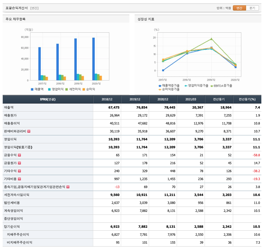 매출액 : 2018년 67,475억원, 2019년 76,854억원, 2020년 78,445억원, 2021년 1분기 20,367억원으로 증가하였습니다. 2021년 1분기는 전년동기대비 7.4% 증가하였습니다. 2020년 분기별로 보면 2분기 17,832억원, 3분기 20,706억원, 4분기 20,944억원입니다.