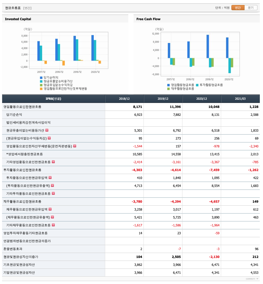투자활동 현금흐름 : 2018년 -4303억원, 2019년 -4614억원, 2020년 -7459억원, 2021년 1분기 -1262억원으로 투자활동 현금흐름이 원활합니다.