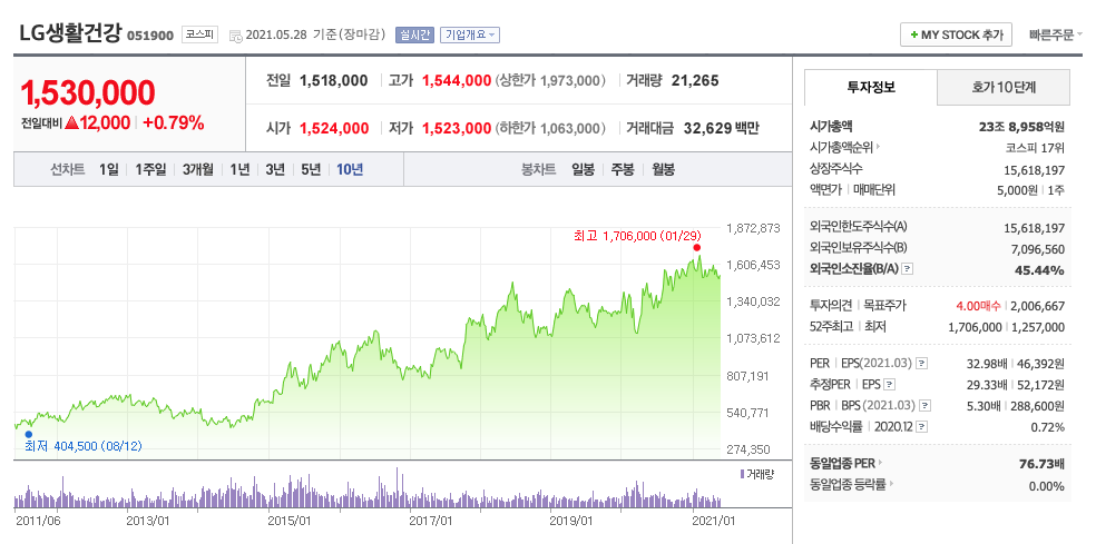 | LG생활건강 | 1,530,000원 | 1,535,220원 | 1,545,198원 | 1,545,404원 |