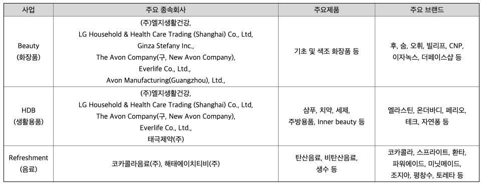 당사의 사업은 Beauty(화장품) 사업, Home Care & Daily Beauty(HDB,생활용품) 사업, Refreshment(음료) 사업으로 구성되어 있습니다. 보고기간 말 각 사업별 주요 종속회사와 주요제품 및 브랜드는 아래와 같습니다.