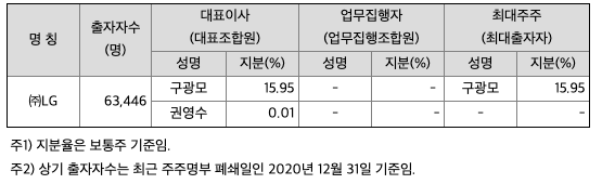 당사 최대주주는 ㈜LG이며, 그 지분(율)은 5,315,500주(34.03%)로서 특수관계인을 포함하여 5,315,500주(지분율 34.03%)입니다.